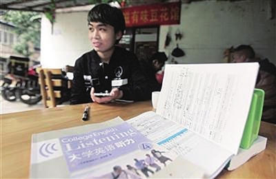 如今,毛召木开始着手准备下半年的成人自考,每天下午拿着英语书籍复习,他希望能够考入国际英语交流相关专业。“这本 《大学英语听力》 是在学校捡的。”毛召木将书捧起,上面满是他做的笔记。他希望读完大学后,能够到北京读研究生,最终成为一名同声传译。(来源:《重庆晨报》)