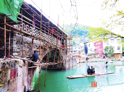 4月3日,工人们正在对咸安区刘家桥古建筑风雨桥进行修缮。刘家桥古民居群始建于明成化9年,建筑群总面积达3.5万平方米,被誉为“楚天民俗第一村”。此次修缮工程工期6个月,采用传统工艺进行修复,以求最大程度地恢复古民居原貌。 赵骥/摄