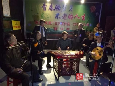 这群老人是原咸宁化肥厂文艺宣传队的队员们,而民兴小区就是原咸宁化肥厂所在地。60年代中期,原化肥厂成立了文艺宣传队,一群爱好文艺的年轻人聚集到一起。在工作之余,唱歌、跳舞、演小品、创作三句半等各种活动,占用了他们业余全部时间。