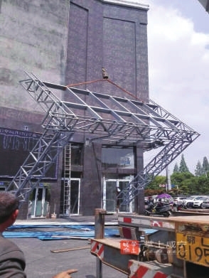 4月12日,在财富广场广告发布商支持配合下,该大队组织执法人员10余人,请来大型吊车和专业操作人员,并动用氧割,依法对该处留存的店招及附属铁架门楼,一并实施了拆除。