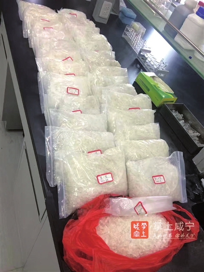 打开编织袋,十余包大小一致的晶体状物品赫然可见,现场称重合计30公斤。后经咸宁市公安局相关部门检测为冰毒,按“行情”能卖到近千万元。