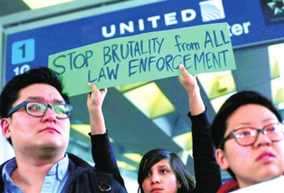 一些芝加哥民众11日下午聚集在奥黑尔国际机场1号航站楼大厅,抗议美国联合航空公司(美联航)将一名亚裔乘客强行拖下飞机的恶劣行径。抗议者手举“抵制美联航”、“亚裔美国人团结起来反抗警察暴力”、“停止一切来自执法机构的暴力”等标语,表达愤怒。有抗议者表示,美联航首席执行官奥斯卡·穆尼奥斯应该引咎辞职。
