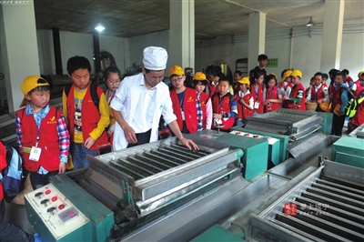 大巴沿着盘旋的山路,到达目的地后,茶场工作人员对小记者们进行了简短的采茶知识培训。来到制茶间,大家被各种机器所吸引,只见刚刚还是新鲜的茶叶,经过一道道工序后,可以直接饮用。了解了茶叶的制作过程,小记者们已经迫不及待进茶园体验摘茶的乐趣。