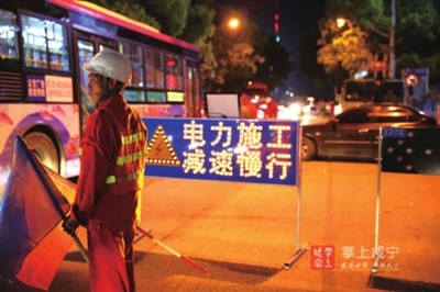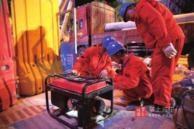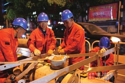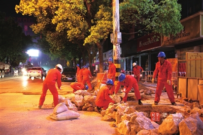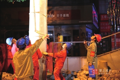 “夜间作业,对于电力施工是一个很大考验,任何一个环节都不容丝毫马虎,尤其是需要在起止端组立电杆,为电缆入地、上杆做好准备,工程难度更是巨大,需要大家现场齐心协力完成。”现场施工负责人谭斌告诉记者,这是他和同事们此项作业的第二个夜间工作时间,以后拆除电杆、大型器械作业等都将采取夜间作业,直至全部电力设施改造完毕。现在夜晚虽然凉风习习,但高强度和高压力的工作让每位施工人员一晚都要湿透几次衣服。