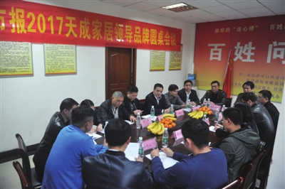 近日,香城都市报2017天成家居领导品牌圆桌会议在本报二楼新闻会客厅召开,来自天成家居的负责人以及十多家一线建材家具领导品牌的负责人参加了会议。会议上,各位家具建材行业的大佬针对咸宁建材家具市场特点如何更好的为市民提供服务,未来咸宁建材家具市场发展趋势等话题畅谈自己的观点,大家一致认为在香城都市报上开设《天成家居专刊》非常必要,是市场发展的必然要求,把天成家居的各大领导品牌从过去追求知名度转变到现在追求美誉度上来。天成家居总经理潘良方表示,作为咸宁市家居行业的标杆企业,在产品质量、售后服务上都有严格的要求,努力为消费者提供一个放心、舒心的购物环境。16家品牌商家负责人也纷纷表示,在产品的质量上要不断的创新,在消费者的服务上也要不断的优化。借助香城都市报《天成家居专刊》,发布最新的建材家具资讯,让更多的消费者了解更多的建材家具常识,帮助消费者选购最满意的家居品牌,引领咸宁家居消费潮流。