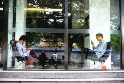 透过玻璃橱窗,两位男士相对坐着,低着头,握着手机,各自默默地“看”着这个科技时代的生活……