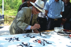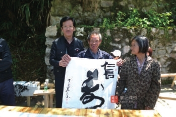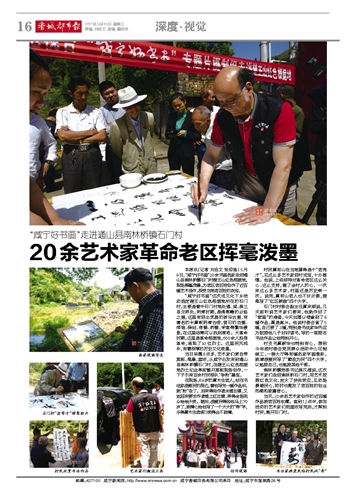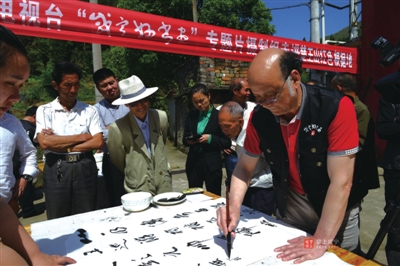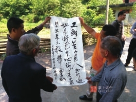 村民夏有山在当地算得是个“老秀才”,见这么多艺术家进村送宝,十分感慨。他说,上级领导对革命老区这么关心、这么支持,暖了全村人的心。一次来这么多艺术家,村里还是历史第一次。说完,夏有山老人也不甘示弱,提笔写了“红区新貌”四个大字。
