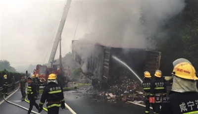 本报讯(记者 程统 通讯员 陈启明)5月7日,京港澳高速咸宁段一辆满载电子产品的货车突发大火,车上运输的价值3000万元左右的货物全部烧毁,所幸无人员伤亡。