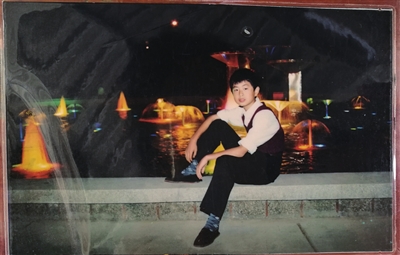 杨建新也为儿子拍下不少“花坛照”。在一张约20年前的夜景照里,杨建新十来岁的儿子坐在花坛水池边,当时新建的喷泉在灯光的映照下十分摩登和美丽。