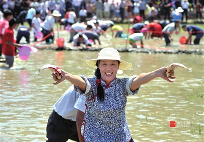 “预备,开始!”捉鱼比赛的号令一下,提着塑料桶的男女老少像离弦的箭一样冲向水田,惊起田中鱼儿无数。“我摸到鱼了,哎,好滑,又跑了!”