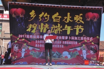 高桥镇党委书记王顺荣表示:“在端午佳日,为了弘扬我国传统节日,宣扬爱国主义情怀,进一步宣传秀美高桥、人文高桥、农耕高桥,同时,着力打造现代特色农产旅游项目,进一步助推精准扶贫工程落到实处,高桥镇人民政府和共青团咸安区委特地选择在山清水秀的澄水洞风景区大屋万新村,开展‘乡约白水畈·粽情端午节’活动。今天,白水畈萝卜深加工产业链项目正式落地高桥,这将助推高桥精准扶贫产业发展;金融扶贫发放坚定了我们打赢脱贫攻坚战的信心和决心;高桥本土名医倾情回乡义诊,为建档立卡贫困户送去了温暖和关怀;爱心捐赠仪式让我们看到了社会各界对教育扶贫的关心和责任。干部受点累,群众得实惠,这样的活动以后我们还会继续开展下去。”