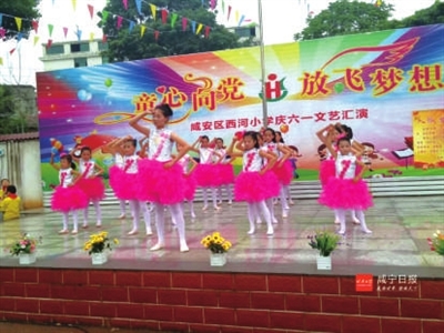 本报讯(记者 庞赟) 5月31日下午,咸安区西河小学校园里洋溢着欢乐的气氛,全校师生兴高采烈地举办了庆“六·一”文艺演出。孩子们精心准备的一个个节目,如朵朵鲜艳的花儿,在校园内尽情绽放!