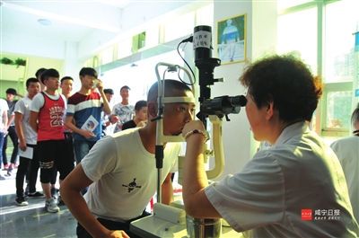 2日,咸宁职业技术学院举行2017年大学生征兵动员大会,该校1000余名大学生了解了参军入伍的流程和相关政策。大学生们纷纷表示,将积极响应祖国召唤,踊跃参军,到绿色军营中施展聪明才智,为实现强国强军梦贡献自己的力量。图为有参军入伍意向的大学生接受视力检查。