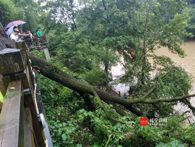 本报讯(记者赵骥 陈志茹)13日上午,城区月亮湾河畔走道上,一棵拥有40多年树龄、20多米高的朗树,因长年遭白蚁啃噬,轰然倒下。