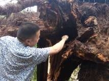 工作人员介绍,这棵朗树高20多米,于13日凌晨倒塌。当日天一亮他们就赶来抢救,发现整个树根中间和底部已被白蚁啃食了,树木内部已经空心。虽然树木顶部还很茂盛,但恰逢近来阴雨天,导致这棵朗树头重脚轻,因承受不了压力,而连根拔起。