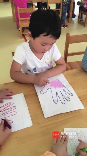 分享会后,为了加深父亲在孩子们心中的形象,幼儿园还组织孩子们开展了“画爸爸”美术活动。在孩子们稚嫩的笔尖下,一幅幅好爸爸的画像新鲜出炉了,孩子们有的亲手做个领结粘贴在爸爸画像上,有的采取手印画形式,与爸爸大手牵小手。还有的,为爸爸画上时髦的发型……