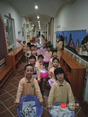 天渐渐黑了,随着老师一声声亲切的呼唤:“亲爱的孩子们,该洗漱啦!”正在玩耍的孩子们立刻回到幼儿园的洗漱间,他们拿着自己的洗漱用具在老师的帮助下,洗了个舒舒服服的热水澡。并即兴穿着各式睡衣在教室空阔的室内场地里进行了一场百变睡衣秀,逗乐了自己也愉悦了他人。