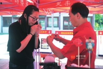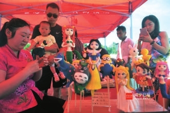 18日上午,在现场传习“非遗”文化的展演更是围满了观众。揪、搓、捏、剪、吹……转眼间,一块糖就在师傅的巧手之下变成一个个色彩鲜艳、惟妙惟肖的“动物”,看的现场观众赞叹不已,一下子把大家带进了童年的回忆。吹糖人是一项古老的民间手艺,以麦芽糖为原料捏制成各种动物或人物造型,不仅具有观赏性,还可食用。现场制作吹糖人是来自武汉的朱红彦,今年49岁,从事吹糖人这项技艺已有30余年,对吹糖人有着不一样的特殊情感,他希望将这项技艺继续传承下去。