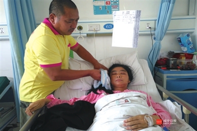 7月28日,记者在崇阳县人民医院住院部内科,见到正在照顾妻子的杨寿昌。
