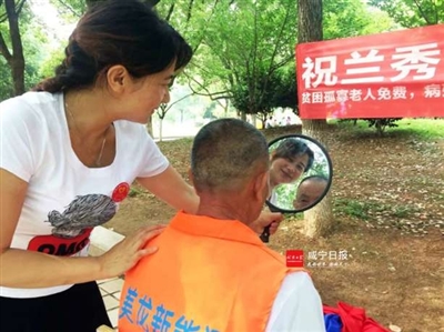 6月4,祝兰秀在赤壁市爱心志愿者服务总队的帮助下,在该市人民广场拉起了“祝兰秀义务为环卫工人理发”的横幅,在广场一旁摆起了桌子、椅子和理发工具。起初,许多市民都不理解祝兰秀的行为,环卫工人也都质疑公益理发的真假。