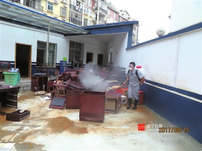 15日,市疾控中心组织专人对城区渍水路段、小区进行消毒防疫,确保灾后无大疫发生。