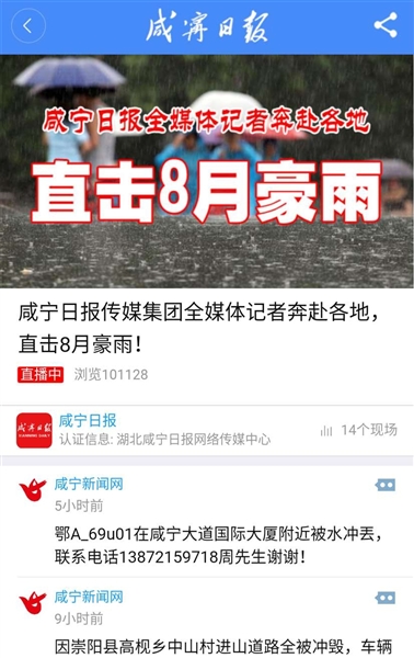 以客户端为主打,咸宁日报、香城都市报、咸宁新闻网,微信、微博,差异化报道,形成立体宣传强势,取得良好宣传效果。其中,咸宁新闻网主办的微信公众号“咸宁微讯”,《咸宁日报全媒体记者雨中直击抗洪救灾现场》当天阅读量达8万+。