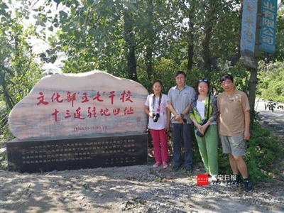 图为当年随父母下放的干校子弟在石刻旁留影。