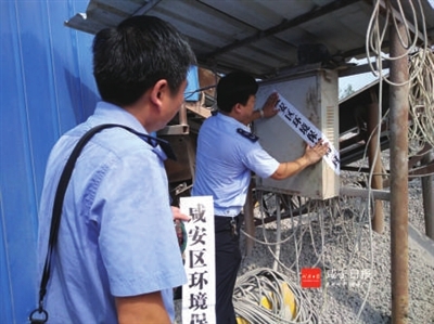 25日,咸安区环保局执法人员在省、市环保“双护双促”综合执法督导组的指导下,对该区的金哲石料加工厂和宝塔万顺建材2家未办理环评手续、非法生产经营石料企业进行了查封。 (图/文 记者 葛建伟 通讯员 周常前 商蓉)