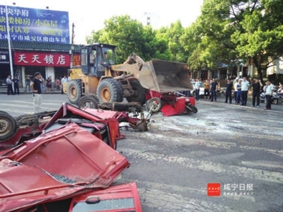 25日,咸安区城管局执法人员在交警部门的支持配合下,在南山三角州现场销毁非法载客营运“麻木”4台。共出动执法人员60人,机械2台,取得了较好的警示震慑作用。 (图/文 记者 葛建伟 通讯员 金文军 余明)