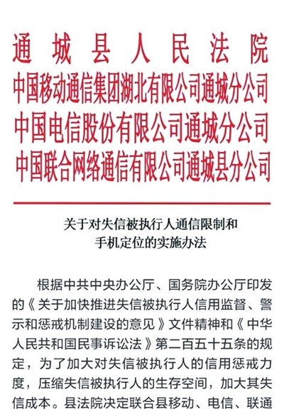 据悉,通城法院是我市第一家对“老赖”实施通信限制的基层法院。记者提醒各位“老赖”在此方案实施之前,赶紧去法院履行还款义务,否则面子可丢大了。
