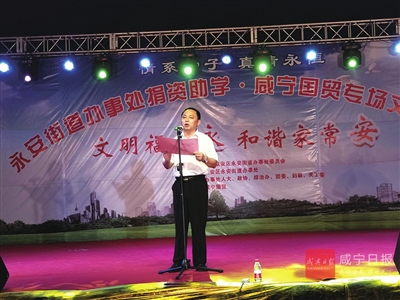 “尊敬的各位同仁、各位来宾,同志们,大家晚上好!情系学子,真爱永恒,金秋的硕果映红了永安大地,真情的帮扶温暖了寒门学子。今天,我们欢聚一堂,举行“金秋助学·圆梦助学”行动文艺晚会。为此,我谨代表永安街道办事处党委,对前来参加本次活动并慷慨解囊、奉献爱心的各界爱心人士(人大代表、政协委员、商界精英)表示衷心的感谢……”当晚八时,该处党委书记、人大主任王煜热情洋溢的致辞,拉开了此次捐资助学文艺晚会序幕。