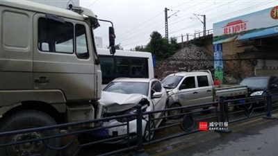 记者在事发现场看到,道路中间的多节护栏已被撞倒,公交车、小轿车等多辆车不同程度受损。事发后,一度造成现场交通堵塞。接到报警后,咸安公安分局交警大队立即启动应急处置预案,召集警力赶赴现场增援,一组民警处理事故,一组民警疏导交通。