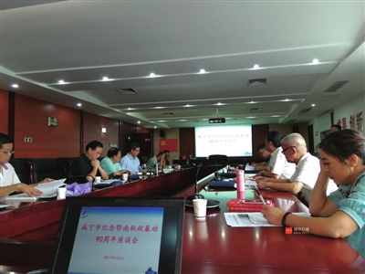 本报讯 “建议建设鄂南秋收暴动纪念馆”、“把咸宁红色革命历史纳入主题党日活动的学习范畴”、“深挖鄂南秋暴历史,助力红色旅游发展”……9月5日,咸宁市举行纪念鄂南秋收暴动90周年座谈会,就如何加强研究、扩大宣传鄂南秋暴等问题,市宣传战线、党史界、社科界、文艺界和档案学界等20余名专家学者进行了深入探讨和交流。