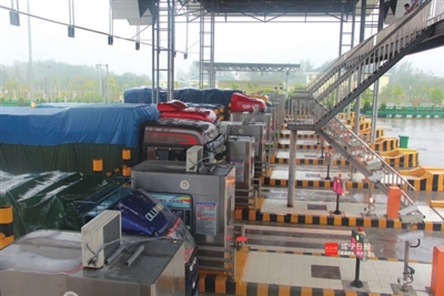 因京港澳高速湖南岳阳段9月11—22日中修,实行交通管制,导致鄂湘段货车需要从中交通界高速通城南分流到长沙平汝高速。连日来,通城南收费站日均车流量猛增至8000台次,平均每分钟5辆车通过通城南收费站。图为19日通界高速通城南收费站分流现场。
