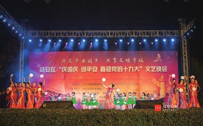 9月29日晚,咸安区在嫦娥广场举行“庆国庆、创平安、喜迎党的十九大”文艺晚会。晚会由该区政法委、区文体新局主办,咸安区群艺馆、区楚剧团承办;咸安区公安分局、区老干部局、区教育局、永安办事处、浮山办事处、马桥镇协办。整台晚会,欢庆、喜悦,激情、奔放。(图/文 记者 葛建伟 通讯员 李明 陈盛武)