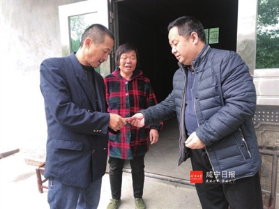 “这是我局一点心意,您收下,拿去给孩子治病……”20日,咸安区农机局党总支成员、副局长江元胜一行3人来到该区双溪桥镇浮桥村5组(李头陈村湾)贫困户陈天申家中,将1000元善款递给他,给他为患病的女儿治病。