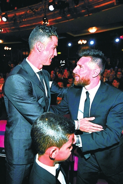 本报综合消息 C罗昨晨力压梅西和内马尔,荣膺2017年度FIFA最佳男足球员。这是葡萄牙人连续两年获此殊荣,算上此前的FIFA世界足球先生和FIFA金球奖,这已是这位皇马巨星5次获奖,这一数量与梅西持平。颁奖现场充满了温情,“绝代双骄”完全没有剑拔弩张的情形,而是互道尊重,英雄惜英雄。