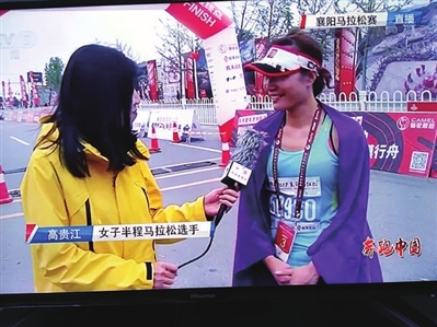 昨日,从我市咸马俱乐部传来好消息,该俱乐部负责人高贵江在昨日完赛的2017襄阳国际马拉松比赛中取得女子半马国内组第一、国际组第三的佳绩。据悉,高贵江是鄂南高中的教师,平时热爱跑步,在10月17日的2017神农架国际马拉松(神马)赛中获女子组半马亚军。昨日接受记者电话采访时表示,她正在和团友全力备战即将开赛的咸宁国际马拉松比赛,力争在家门口取得好成绩。(图为高贵江在中央电视台体育频道直播中接受采访) (记者 程昌宗)
