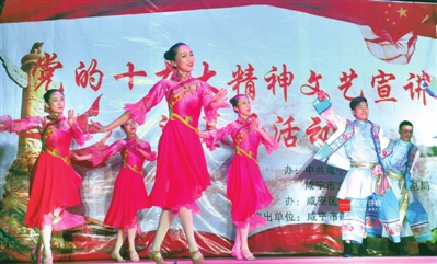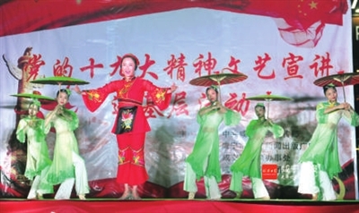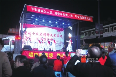歌曲《咱老百姓》、独唱《荆楚平安》、舞蹈《共筑中国梦》……昨晚,在温泉城区万年路社区潜山商业街广场,党的十九大精神文艺宣讲进基层活动我市首场演出火热开演,由市歌舞团组建的文艺宣讲队,为社区居民送去了一场精彩纷呈的文艺晚会。镇强赵忠志/摄 2版