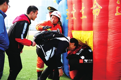 昨日是第27个全国“119”消防日。当日,温泉消防大队在温泉中辉国际广场举行2017年度消防安全宣传月活动启动仪式。图为市民现场上演逃生演练。 (记者陈志茹 赵忠志 通讯员朱燕林 柳丹)