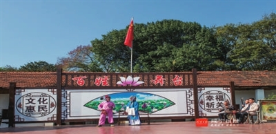 官埠桥镇泉湖村的乡村大舞台依山而建,舞台后的千竿绿竹成了最天然的背景图。“舞台建设没有改变山体形态,没有毁林毁竹,节约下来的资金用来修林间栈道和长椅,安装路灯,村民到广场跳广场舞、打威风锣鼓,到林荫道纳凉休闲,村民都赞不绝口。”泉湖村妇女主任余艳说。