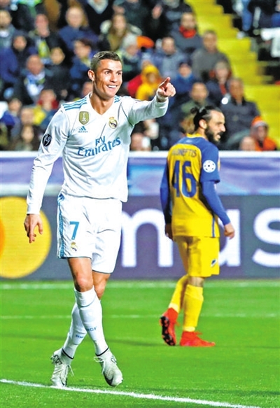 C罗在第54分钟迎来里程碑时刻:本泽马传出好球,葡萄牙巨星左脚扫射打进空门。C罗代表皇马在欧冠打进98球,从而超过梅西(为巴塞罗那在欧冠打进97球),创造效力单一球队的欧冠进球纪录。C罗在2017年欧冠打进18球,包括2016-2017赛季后半段和2017-2018赛季前半段,打破自己保持的自然年的欧冠进球纪录(2015年在欧冠打进17球)。