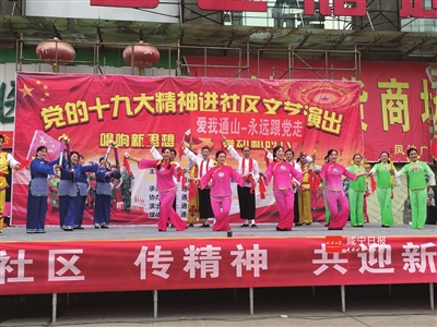 11月20日,由通山县委宣传部、通山县文化体育和新闻出版局联合主办,文化馆组织的两支民间文艺团队兵分两路,一队进乡村,一队进社区,通过原创的山歌山鼓、采茶戏、快板、三句半、歌舞等形式,宣传党的十九大精神。观众看得津津有味,掌声经久不息。