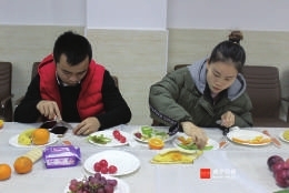 当日上午9时,活动还没开始,现场就已经座无虚席。看着面前的水果,孕妈们早已跃跃欲试。随着老师的一声令下,孕妈们手持各种各样的工具开始忙碌起来,她们大多和准爸爸或是和婆婆、孩子一起,有的负责切水果,有的负责摆造型,大家都开动脑筋,相互配合,现场爱意浓浓。