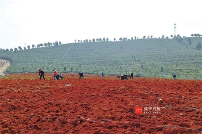 只见现场,红色的山丘被推土机理成大片规整的平地,来自该村的几十名村民忙碌其间,将一株株茶苗沿着事先画好的白线规整地栽进土里。