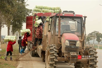12月27日,嘉鱼县潘家湾镇潘家湾村6组村民陈国江家的蔬菜地里,采收人员正在将装好的大白菜搬上大卡车,准备运往广州市场。