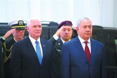 彭斯22日到访耶路撒冷,以色列总理本雅明·内塔尼亚胡在总理府外的帐篷中为他举行欢迎仪式。