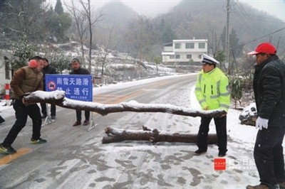 在通山九宫山景区,通山县公安局交警持续进行路面巡查,发现景区路面结冰已封路,洪港镇新庄存至牛鼻孔路段道路有断竹,大畈镇白泥村路段出现塌方现象,第一时间设置标志,组织人力驻守,提醒过往车辆谨慎驾驶。