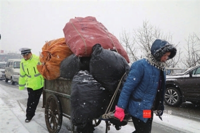 “前面的行人请让行下、靠边行走,让车辆优先通过、否则车辆熄火后,难以起步”,执勤民警不畏严寒、坚持不懈,始终在107国道口镇守,劝导和指挥过往群众和司机注意安全。
