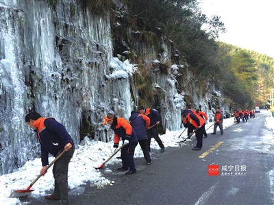 通山养护公司80人早上6点就出发,每天工作19小时,只要雪花飘落,任雪风寒,随时出发。